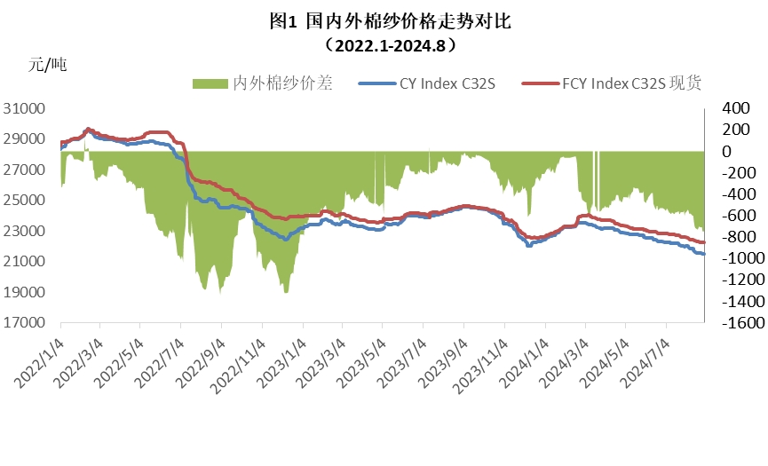 8月內(nèi)外棉紗價格均下跌,國產(chǎn)32支純棉紗月均價為21719元/噸,環(huán)比下跌了439元,跌幅2%,同比下跌了2607元,跌幅10.7%;進(jìn)口32支純棉紗8月均價22379元/噸,環(huán)比下跌了347元,跌幅1.5%,同比下跌了2051元,跌幅8.4%。