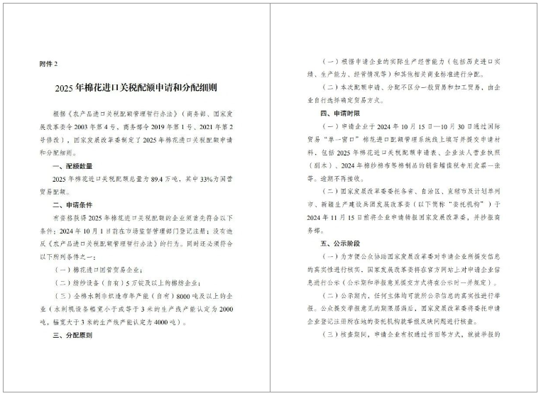 根據(jù)《農(nóng)產(chǎn)品進(jìn)口關(guān)稅配額管理暫行辦法》及相關(guān)修訂,2025年棉花進(jìn)口關(guān)稅配額總量確定為89.4萬噸,其中33%為國營貿(mào)易配額。此舉旨在調(diào)控國內(nèi)外棉花市場,保障國內(nèi)棉花產(chǎn)業(yè)的穩(wěn)定發(fā)展。