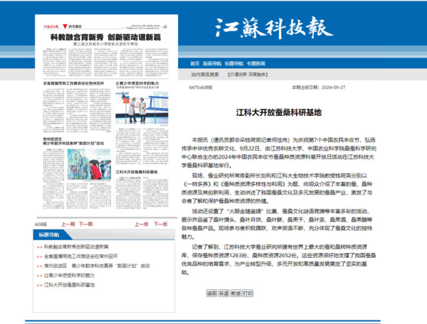 為慶祝第7個(gè)中國(guó)農(nóng)民豐收節(jié),弘揚(yáng)傳承中華優(yōu)秀農(nóng)耕文化,9月22日,由江蘇科技大學(xué)、中國(guó)農(nóng)業(yè)科學(xué)院桑蠶科學(xué)研究中心聯(lián)合主辦的2024年中國(guó)農(nóng)民豐收節(jié)蠶桑種質(zhì)資源科普開(kāi)放日活動(dòng)在江蘇科技大學(xué)蠶??蒲谢嘏e行。