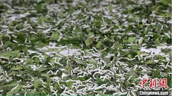 在養(yǎng)蠶大戶李明智的桑蠶養(yǎng)殖基地里,一條條胖乎乎的大蠶正昂著頭嗷嗷待哺。李明智和工人們抓著一大把翠綠的桑葉撒在蠶身上。