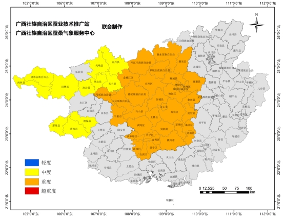 廣西蠶業(yè)技術(shù)推廣站聯(lián)合有關(guān)市縣氣象、農(nóng)業(yè)農(nóng)村等部門,應(yīng)用自主研發(fā)的“廣西家蠶血液型膿病預(yù)測預(yù)報模型”發(fā)布蠶病預(yù)測預(yù)警信息:2024年10月上旬,桂西(那坡)地區(qū)發(fā)生等級為中度(Ⅱ級),發(fā)病率在5.01%-10.00%;桂西北(宜州)、桂西北(環(huán)江)地區(qū)發(fā)生等級為重度(Ⅲ級),發(fā)病率在10.01%-15.00%;其他地區(qū)發(fā)病情況詳見全區(qū)態(tài)勢圖,請廣大蠶農(nóng)在養(yǎng)蠶過程中注意蠶病防控。