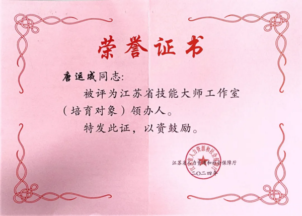根據(jù)省人社廳《關(guān)于組織開展2024年江蘇省高技能人才重點(diǎn)項(xiàng)目申報(bào)推薦工作的通知》(蘇人社發(fā)〔2023〕59號(hào))要求,省人社廳組織開展了國家級(jí)、省級(jí)高技能人才重點(diǎn)項(xiàng)目評(píng)審工作,經(jīng)組織推薦、形式審查、材料評(píng)審、實(shí)地考察和研究決議,唐運(yùn)成被評(píng)為江蘇省技能大師工作室(培育對(duì)象)領(lǐng)辦人。