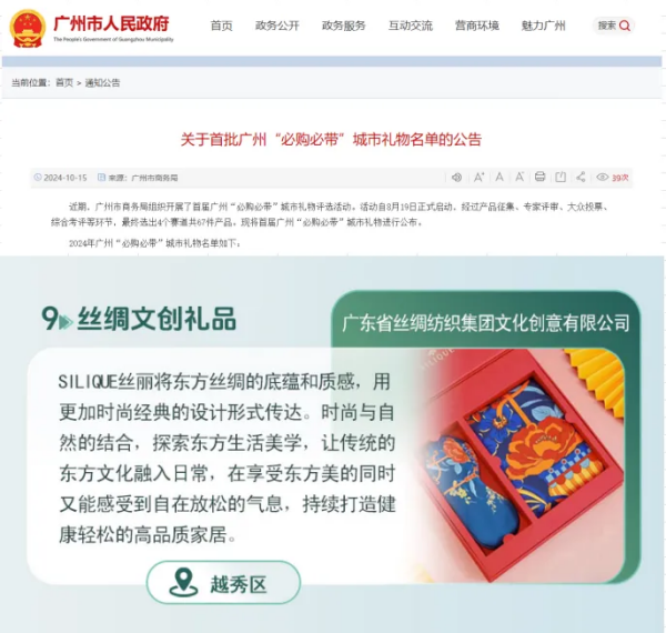 10月15日,由廣州市商務(wù)局組織,并邀請主管部門、行業(yè)專家、媒體代表等組成“必購必帶”評審委員會評選,并結(jié)合大眾選票的首批廣州“必購必帶”城市禮物名單公布。廣東省絲綢紡織集團(以下簡稱絲紡集團)所屬企業(yè)廣東省絲綢紡織集團文化創(chuàng)意有限公司的嶺南花卉系列絲巾文創(chuàng)禮盒入選“時尚潮品”品類。