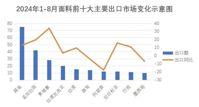 今年1-8月,越南作為我面料出口最大的單一市場,占我面料對全球出口的16.8%,出口額74.9億美元,同比增長12.9%。