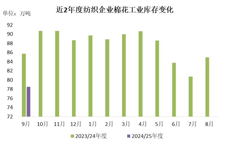 月內(nèi)紗廠訂單有所回暖,但新舊年度交接之際,性價(jià)比高的合適資源較為緊張,企業(yè)僅剛需采購(gòu),等待新棉上市,總體原料庫(kù)存小幅下降。截至9月30日,紡織企業(yè)在庫(kù)棉花工業(yè)庫(kù)存量為78.5萬(wàn)噸,環(huán)比減少6.4萬(wàn)噸,同比減少7.2萬(wàn)噸。其中:25%的企業(yè)增加棉花庫(kù)存,45%減少庫(kù)存,30%基本保持不變。
