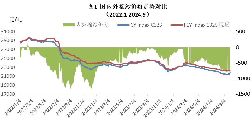 本月內(nèi)外棉紗價(jià)格均下跌,國(guó)產(chǎn)32支純棉紗9月均價(jià)為21495元/噸,環(huán)比下跌了224元,跌幅1%,同比下跌了3029元/噸,跌幅12.35%;進(jìn)口32支純棉紗9月均價(jià)22255元/噸,環(huán)比下跌了124元,跌幅0.55%,同比下跌了2314元,跌幅9.42%。