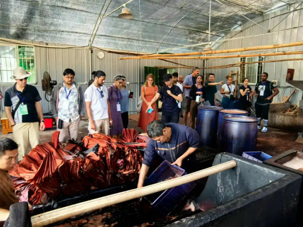 來訪學(xué)員在倫教曬莨場(chǎng)參觀學(xué)習(xí)了國(guó)家級(jí)非遺傳承香云紗染整技藝流程包括制備莨水、浸莨水、拉幅、掃莨水、踢竹、收布等工序;在“珠三角蠶??茖W(xué)館”“倫教香云紗展示交易中心”參觀學(xué)習(xí)珠三角蠶桑生產(chǎn)歷史、?;~塘和香云紗文化,了解香云紗公司文創(chuàng)文旅成果轉(zhuǎn)化和線上線下銷售推廣模式。