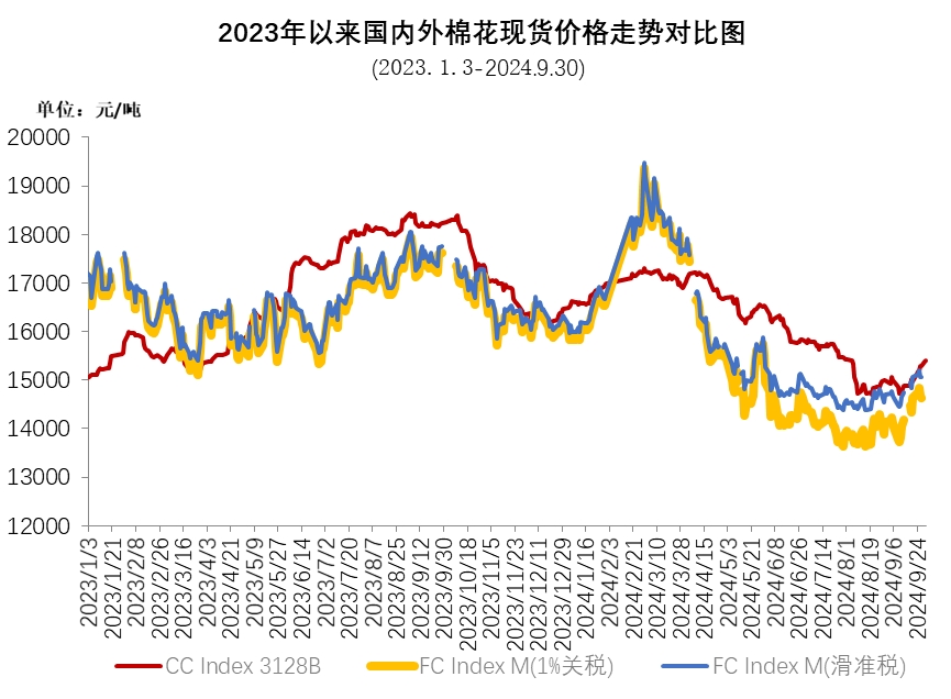 9月,國(guó)內(nèi)宏觀經(jīng)濟(jì)氛圍走暖,大宗商品市場(chǎng)普遍回升,受此影響,國(guó)內(nèi)棉花期現(xiàn)貨價(jià)格持續(xù)上行。同時(shí),棉紡織行業(yè)傳統(tǒng)旺季來(lái)臨,訂單略有好轉(zhuǎn),開(kāi)工率普遍上升,棉紗類紡織成品銷售價(jià)格上漲,棉花需求有所回暖,中國(guó)棉花價(jià)格指數(shù)持續(xù)上行,月內(nèi)最高漲至15410元/噸。同期,受美聯(lián)儲(chǔ)降息及外圍上漲帶動(dòng),國(guó)際棉價(jià)最高漲至74.55美分/磅,月底受農(nóng)產(chǎn)品價(jià)格普跌及裝運(yùn)數(shù)據(jù)持續(xù)疲軟影響,國(guó)際棉價(jià)小幅回落至73美分/磅附近,但國(guó)際棉價(jià)漲幅仍大于國(guó)內(nèi),內(nèi)外棉現(xiàn)貨價(jià)差收窄。