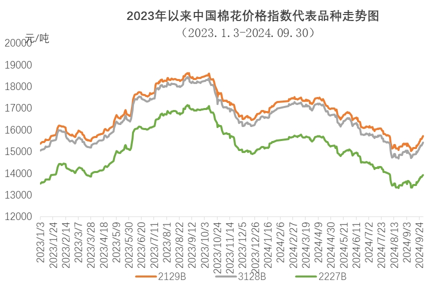 9月,國(guó)內(nèi)宏觀經(jīng)濟(jì)政策持續(xù)發(fā)力,棉花期現(xiàn)貨迅速上漲。伴隨棉紡織行業(yè)進(jìn)入旺季,企業(yè)開(kāi)機(jī)率持續(xù)上升,棉紗等紡織成品價(jià)格上漲,棉花需求逐漸轉(zhuǎn)暖,帶動(dòng)中國(guó)棉花價(jià)格指數(shù)持續(xù)上漲。月內(nèi)中國(guó)棉價(jià)價(jià)格指數(shù)(CCIndex3128B)最高漲至15410元/噸。中國(guó)棉花價(jià)格指數(shù)(CCIndex3128B)月均價(jià)為15025元/噸,環(huán)比上漲76元,同比下跌3218元。