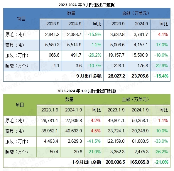 2024年前三季度,我國羽絨行業(yè)出口總額約16.5億美元,同比下滑21.0%,降幅環(huán)比1-8月小幅縮窄0.9個百分點,原毛和寢具出口量同比小幅上漲,服裝出口量大幅下滑。具體來看,1-9月原毛出口量約2.8萬噸,同比上漲4.2%,出口額約5.0億美元,同比略漲1.1%;寢具出口量約4.1萬噸,同比上漲4.5%,出口額約3.0億美元,同比下滑10.0%;服裝出口量約2629.3萬件,同比大幅下滑41.5%,出口額約8.2億美元,同比下滑33.0%。