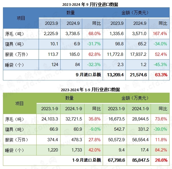 24年前三季度羽絨行業(yè)進(jìn)口漲幅擴(kuò)大 出口下滑明顯