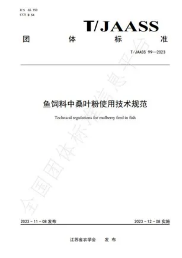 近日,江蘇省農(nóng)學(xué)會團體標準《魚飼料中桑葉粉使用技術(shù)規(guī)范》正式發(fā)布,標準編號為“T/JAASS 99—2023”。該標準由江蘇科技大學(xué)作為牽頭單位,中國水產(chǎn)科學(xué)研究院淡水漁業(yè)研究中心、廣東省農(nóng)業(yè)科學(xué)院蠶業(yè)與農(nóng)產(chǎn)品加工研究所、西南大學(xué)、農(nóng)業(yè)農(nóng)村部蠶桑產(chǎn)業(yè)產(chǎn)品質(zhì)量監(jiān)督檢驗測試中心(鎮(zhèn)江)作為參編單位共同編制而成。