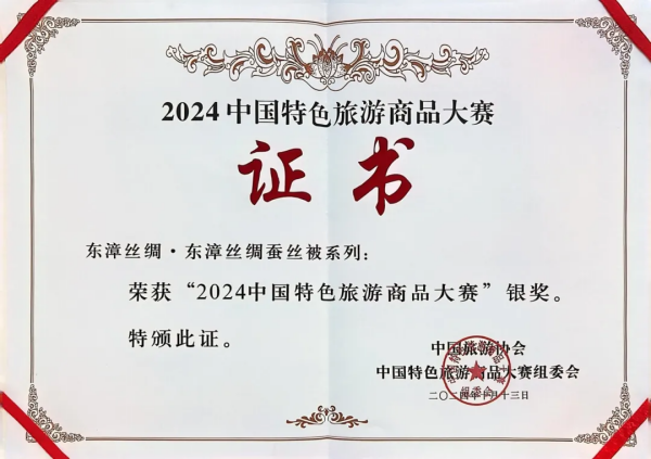 近日,湖北省南漳縣特色旅游商品——東漳絲綢·東漳絲綢蠶絲被系列在2024中國特色旅游商品大賽暨2024中國旅游商品大賽中,榮獲2024年中國特色旅游商品大賽銀獎,這是南漳縣旅游產(chǎn)品首獲國家級獎項。