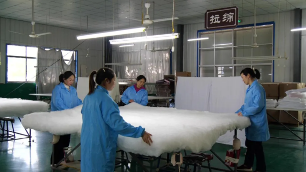 除了優(yōu)質(zhì)的原材料保障,在生產(chǎn)環(huán)節(jié)中,該公司同樣精益求精。從打棉、煮棉到烘棉,每一道工序都絲絲入扣,通過純手工千層拉制法,將一層層蠶絲拉扯均勻,既保證了產(chǎn)品舒適度,又進(jìn)一步延長了使用壽命。
