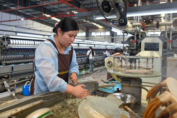 “根據(jù)生絲規(guī)格及生產(chǎn)工藝?yán)w度要求,我們將6至9粒繭合并順次離解制成生絲?!笨壗z車間工人李莎一邊嫻熟地操作著一邊介紹說。