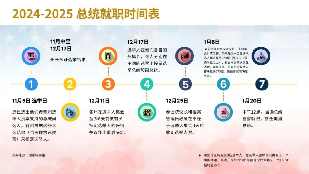 看下美國(guó)大選接下來(lái)的時(shí)間表:11月5日:選舉投票日;12月17日:選舉人團(tuán)投票,在各自州舉行;2025年1月3日之前:選舉人票完成歸檔并移交國(guó)會(huì);2025年1月6日:美國(guó)國(guó)會(huì)舉行會(huì)議,由參眾兩院的兩黨代表宣讀并清點(diǎn)選舉人團(tuán)投票結(jié)果,由副總統(tǒng)兼參院議長(zhǎng)宣布勝選者; 2025年1月20日:在國(guó)會(huì)大廈舉行總統(tǒng)就職典禮。