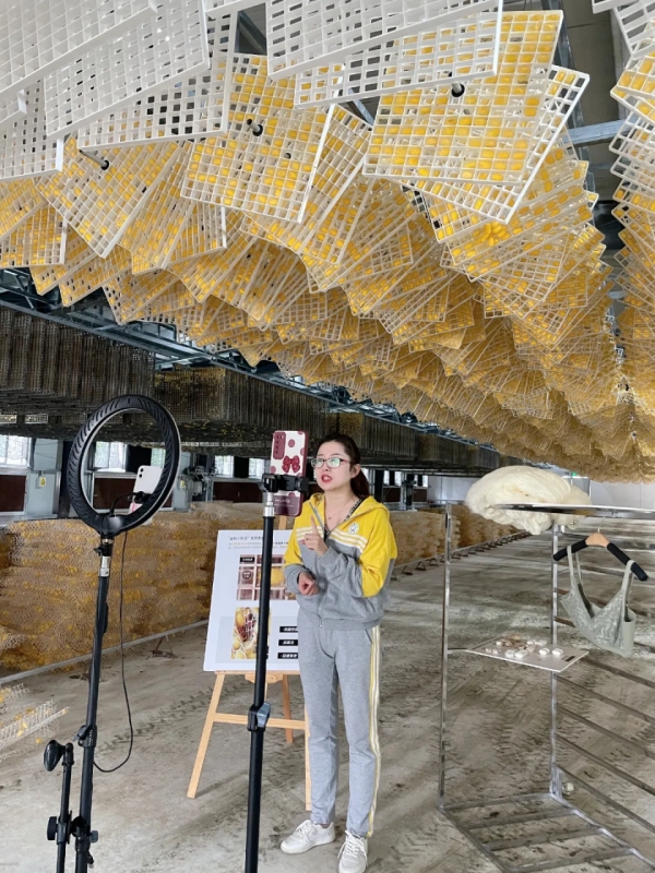 此外,還自主開發(fā)了一系列蠶繭文創(chuàng)產(chǎn)品作為本村特色旅游伴手禮,并形成一條成熟的生產(chǎn)流水線,帶領(lǐng)村民共同致富的同時積極與企業(yè)展開合作,將蠶絲產(chǎn)品和衍生商品一同搬進直播間,為蠶桑文化的傳播插上“數(shù)字翅膀”,進一步促進蠶桑文化的“新絲路”通達全國、連接四海。