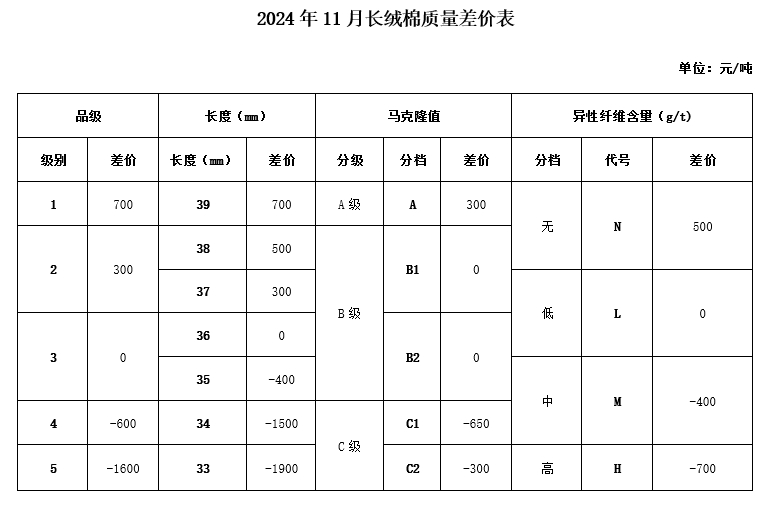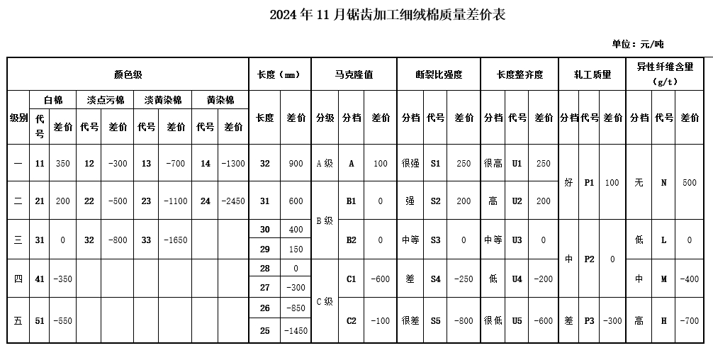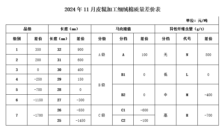 根據(jù)《中國棉花協(xié)會國產棉質量差價表管理辦法》規(guī)定,現(xiàn)正式發(fā)布2024年11月《鋸齒加工細絨棉質量差價表》、《皮輥加工細絨棉質量差價表》和《長絨棉質量差價表》(單位:元/噸)。