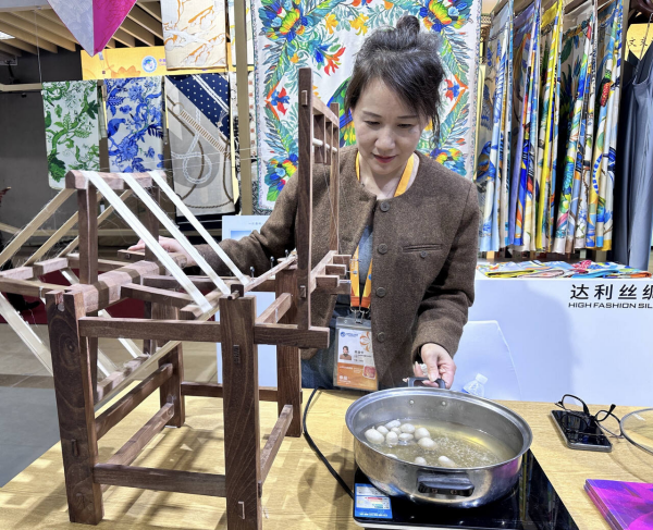 走到達利絲綢(浙江)有限公司的展臺,映入眼簾的是一臺土制手工繅絲機。工作人員現(xiàn)場向記者展示簡易操作,觀眾紛紛通過動手體驗,觀察如何從蠶繭中抽取蠶絲的全過程,體驗非遺工藝無與倫比的魅力。當蠶繭成熟后,蠶蛹會分泌一種特殊的液體,將自己周圍的繭絲黏合在一起。蠶蛹解絲后,工作人員將蠶繭現(xiàn)場烹煮,放入拉絲機中進行拉伸,使其變得更細長且均勻。