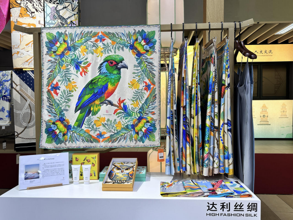 達利絲綢是國家絲綢產品開發(fā)基地,也是國家絲綢產品流行趨勢研究發(fā)布中心。達利絲綢曾作為2014APEC會議領導人服裝、2016年G20杭州峰會指定產品、2020年聯(lián)合國成立75周年活動禮品、2020年東京奧運會中國體育代表團開幕式禮服、2022年北京冬奧會頒獎禮服面料的設計和制造企業(yè)。據(jù)展臺負責人介紹,本次進博會上,達利絲綢還有一個亮點便是以南美大陸拍攝的飛鳥照片為靈感創(chuàng)作的一系列原創(chuàng)絲巾產品。他們希望通過進博會這個平臺,在國際舞臺上碰撞出全新的無限可能。