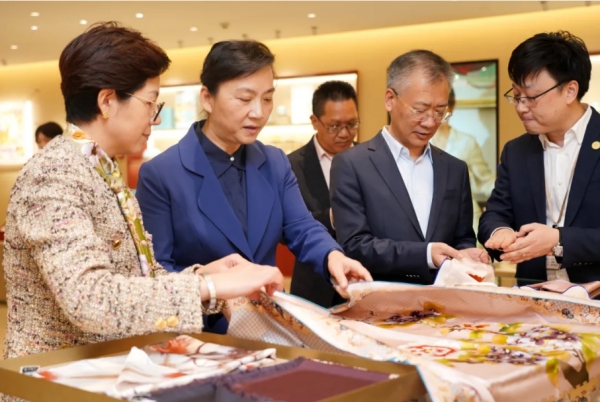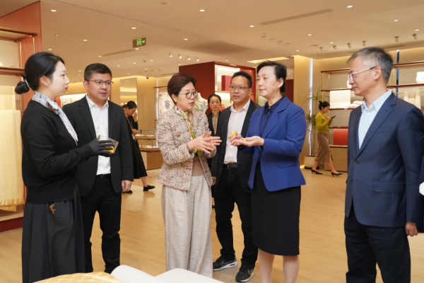 參觀萬事利絲綢藝術館、企業(yè)文化館及品牌展示中心,從東西方絲綢藝術珍品的保護、企業(yè)創(chuàng)始人精神的傳承到絲綢時尚精品的展示,王文序部長強調,核心技術是企業(yè)參與全球競爭的“硬通貨”,加強核心技術保護對于浙江企業(yè)保持創(chuàng)新領先地位、應對國際挑戰(zhàn)至關重要。
