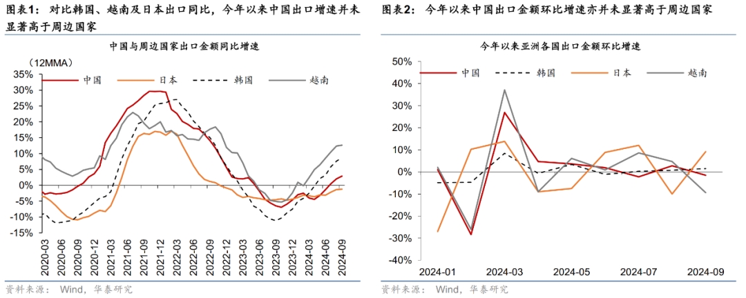 從今年情況來看,從國際對比上,今年以來,中國出口增速并未有明顯高于周邊亞洲國家、或體現(xiàn)出今年仍未出現(xiàn)大規(guī)模搶出口效應(yīng)。
