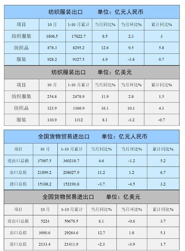 10月紡織品、服裝出口均實(shí)現(xiàn)快速增長(zhǎng)