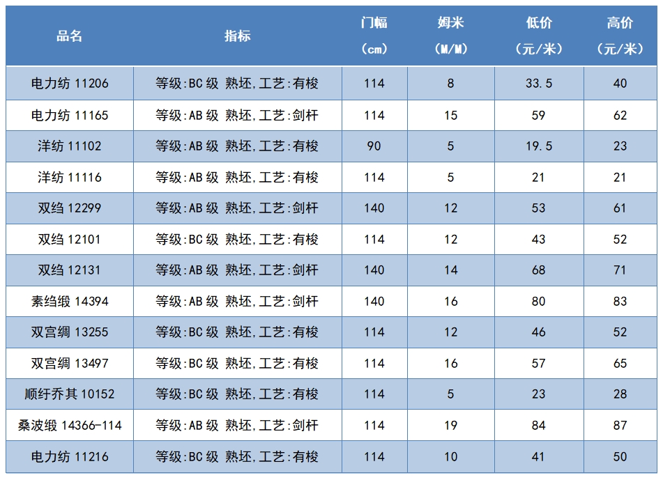 本周綢緞指數(shù)協(xié)作單位成交價(jià)格區(qū)間