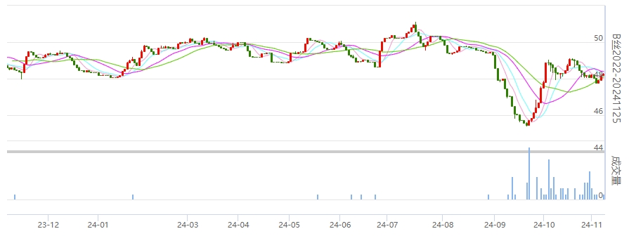 今日(2024年11月08日,周五)中國(guó)繭絲綢交易市場(chǎng)生絲電子指數(shù)上漲0.36%收于4790.21點(diǎn),本周生絲指數(shù)下跌0.21%。B絲2022D(商檢4A級(jí)生絲):241125合約上漲0.06萬(wàn)元報(bào)收于48.27萬(wàn)元;250325合約上漲0.54萬(wàn)元報(bào)收于48.18萬(wàn)元;250925合約上漲0.33萬(wàn)元報(bào)收于47.61萬(wàn)元。