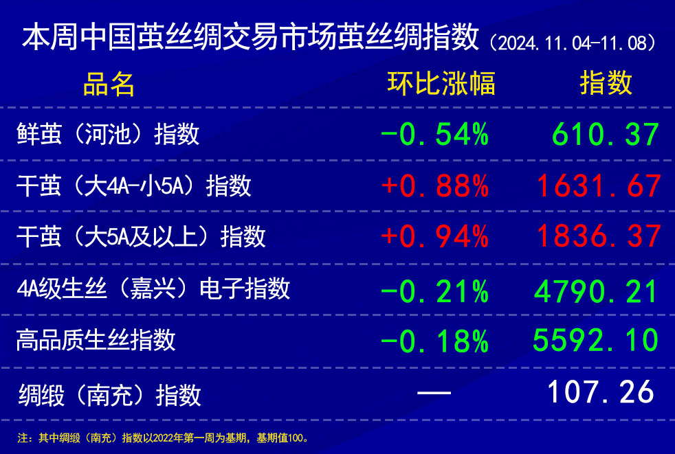本周中國(guó)繭絲綢交易市場(chǎng)繭絲綢指數(shù)