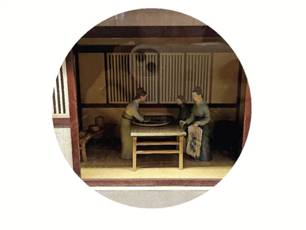博物館一樓的“錦程:中國絲綢與絲綢之路”主題展覽,一排展現(xiàn)古人養(yǎng)蠶織綢過程的微縮模型圖映入眼簾。講解員官琴介紹,這些微縮模型以南宋高宗吳皇后題注本《蠶織圖》為創(chuàng)作藍(lán)本,描繪了南宋初期浙東一帶種桑、養(yǎng)蠶、織造等絲綢生產(chǎn)過程。