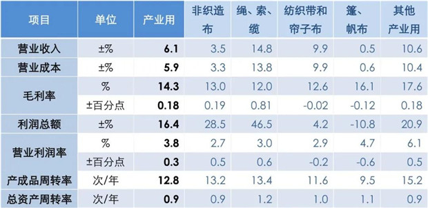 表1 2024年1-9月產(chǎn)業(yè)用紡織品行業(yè)運行主要經(jīng)濟指標(規(guī)模以上)
