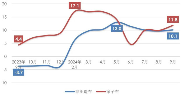 自2024年以來,非織造布的產(chǎn)量回升勢頭良好,根據(jù)國家統(tǒng)計局數(shù)據(jù),2024年1-9月規(guī)模以上企業(yè)的非織造布產(chǎn)量同比增長10.1%,月均產(chǎn)量較上半年繼續(xù)提升。隨著乘用車市場逐步回暖,簾子布的生產(chǎn)在經(jīng)歷了上半年的波動后重回兩位數(shù)增長,1-9月規(guī)模以上企業(yè)的簾子布產(chǎn)量同比增長11.8%(圖2)。