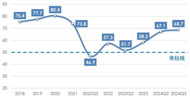 2024年前三季度,全球經(jīng)濟增長勢頭強勁,但通貨膨脹壓力、貿(mào)易緊張局勢和投資環(huán)境趨緊等問題依然存在;我國經(jīng)濟運行總體穩(wěn)中有進,高質(zhì)量發(fā)展扎實推進,向好因素累積增多。我國產(chǎn)業(yè)用紡織品行業(yè)經(jīng)濟運行呈恢復性增長態(tài)勢,市場需求持續(xù)復蘇,行業(yè)出口整體處于回暖區(qū)間。根據(jù)協(xié)會調(diào)研,2024年前三季度我國產(chǎn)業(yè)用紡織品行業(yè)景氣指數(shù)為68.7,較上半年提升1.6個百分點(圖1)。