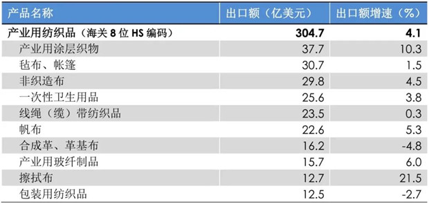 表2 2024年1-9月產(chǎn)業(yè)用紡織品行業(yè)及主要產(chǎn)品出口情況