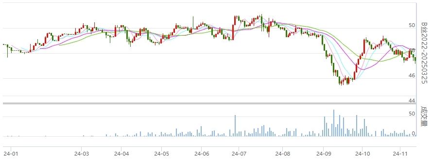 今日(2024年11月13日,周三)中國(guó)繭絲綢交易市場(chǎng)生絲電子指數(shù)下跌0.39%收于4762.68點(diǎn)。B絲2022D(商檢4A級(jí)生絲):241125合約下跌0.21萬(wàn)元報(bào)收于48.06萬(wàn)元;250325合約下跌0.27萬(wàn)元報(bào)收于47.43萬(wàn)元;250925合約下跌0.54萬(wàn)元報(bào)收于46.89萬(wàn)元。
