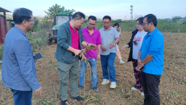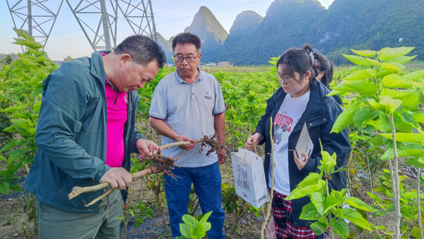 11月8日下午,劉吉平一行在嘉聯(lián)公司常務(wù)副總經(jīng)理韋年光及宜州農(nóng)業(yè)農(nóng)村部門相關(guān)人員陪同下,首先到德勝鎮(zhèn)上坪村劉三姐桑蠶高效生態(tài)產(chǎn)業(yè)示范區(qū)嘉聯(lián)公司生產(chǎn)基地及周邊桑園,現(xiàn)場查看桑樹病蟲害的發(fā)生狀況,并現(xiàn)場采集了相關(guān)病害樣本。針對桑樹病蟲害的防控技術(shù),劉吉平采用通俗易懂的方式進行了詳盡闡釋,特別著重強調(diào)了桑樹根結(jié)線蟲病防控的重要性,并提出了包括及時清園、消毒等在內(nèi)的多項解決方案。