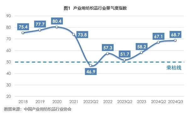 2024年前三季度,全球經(jīng)濟(jì)增長勢頭強(qiáng)勁,但通貨膨脹壓力、貿(mào)易緊張局勢和投資環(huán)境趨緊等問題依然存在;我國經(jīng)濟(jì)運(yùn)行總體穩(wěn)中有進(jìn),高質(zhì)量發(fā)展扎實(shí)推進(jìn),向好因素累積增多。我國產(chǎn)業(yè)用紡織品行業(yè)經(jīng)濟(jì)運(yùn)行呈恢復(fù)性增長態(tài)勢,市場需求持續(xù)復(fù)蘇,行業(yè)出口整體處于回暖區(qū)間。根據(jù)協(xié)會(huì)調(diào)研,2024年前三季度我國產(chǎn)業(yè)用紡織品行業(yè)景氣指數(shù)為68.7,較上半年提升1.6個(gè)百分點(diǎn)(圖1)。