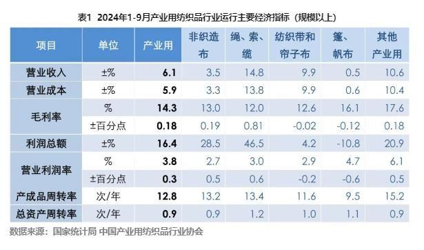 根據(jù)國家統(tǒng)計(jì)局?jǐn)?shù)據(jù),2024年前三季度,我國產(chǎn)業(yè)用紡織品行業(yè)規(guī)模以上企業(yè)的營業(yè)收入和利潤總額分別同比增長6.1%和16.4%;根據(jù)中國產(chǎn)業(yè)用紡織品行業(yè)協(xié)會(huì)測算,行業(yè)規(guī)模以上企業(yè)的營業(yè)利潤率為3.8%,同比提高0.3個(gè)百分點(diǎn);行業(yè)虧損面為23.6%,較上半年收窄1.6個(gè)百分點(diǎn)。2024年以來,在低基數(shù)效應(yīng)、國內(nèi)外市場需求復(fù)蘇等因素疊加影響下,行業(yè)主要經(jīng)濟(jì)效益指標(biāo)持續(xù)回升向好,但仍面臨原材料價(jià)格波動(dòng)、需求支撐不足、市場競爭激烈等挑戰(zhàn)。