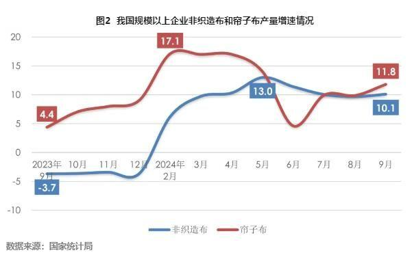 自2024年以來,我國非織造布的產(chǎn)量回升勢頭良好。根據(jù)國家統(tǒng)計(jì)局?jǐn)?shù)據(jù),2024年1-9月,規(guī)模以上企業(yè)的非織造布產(chǎn)量同比增長10.1%,月均產(chǎn)量較上半年繼續(xù)提升。隨著乘用車市場逐步回暖,簾子布的生產(chǎn)在經(jīng)歷了上半年的波動(dòng)后重回兩位數(shù)增長,1-9月規(guī)模以上企業(yè)的簾子布產(chǎn)量同比增長11.8%(圖2)。