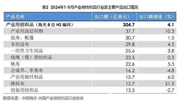 根據(jù)中國海關(guān)數(shù)據(jù)(海關(guān)8位HS編碼統(tǒng)計(jì)數(shù)據(jù)),2024年前三季度,我國產(chǎn)業(yè)用紡織品行業(yè)出口額達(dá)到304.7億美元,同比增長4.1%,增幅相比二季度擴(kuò)大了0.8個(gè)百分點(diǎn)(表2);行業(yè)進(jìn)口額為37.4億美元,同比下降4.8%,降幅相比二季度繼續(xù)收窄。2024年前三季度,我國產(chǎn)業(yè)用紡織品行業(yè)的重點(diǎn)產(chǎn)品(56、59章)對主要市場的出口都保持了較高增速,如對越南、美國的出口額分別增長19.9%、11.4%,對柬埔寨的出口額增長27.7%;但對印度、俄羅斯的出口額分別下降7.8%和10.1%。從主要出口產(chǎn)品來看,產(chǎn)業(yè)用涂層織物、氈布/帳篷、非織造布、尿褲衛(wèi)生巾、線繩纜帶、帆布、產(chǎn)業(yè)用玻纖制品等重點(diǎn)出口產(chǎn)品的出口額在2024年前三季度都保持了一定的增長;擦拭類產(chǎn)品(干濕巾)、結(jié)構(gòu)增強(qiáng)用紡織品、其他工業(yè)用紡織品的出口額保持了較高的增長速度;尿褲、衛(wèi)生巾等一次性衛(wèi)生用品的海外需求收縮,盡管出口額繼續(xù)保持增長,但增速已較2023年同期降低了10個(gè)百分點(diǎn)。