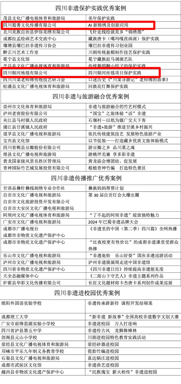 據(jù)介紹,此次優(yōu)秀案例推選收到了全省共計(jì)383個(gè)項(xiàng)目報(bào)名,它們?cè)诜沁z保護(hù)傳承方面的探索鮮活而生動(dòng)。其中四川蜀菁文化傳播有限公司的“AI新錦繡及創(chuàng)新應(yīng)用”和四川銀河地毯有限公司的“四川銀河絲毯項(xiàng)目保護(hù)實(shí)踐”成功入選。