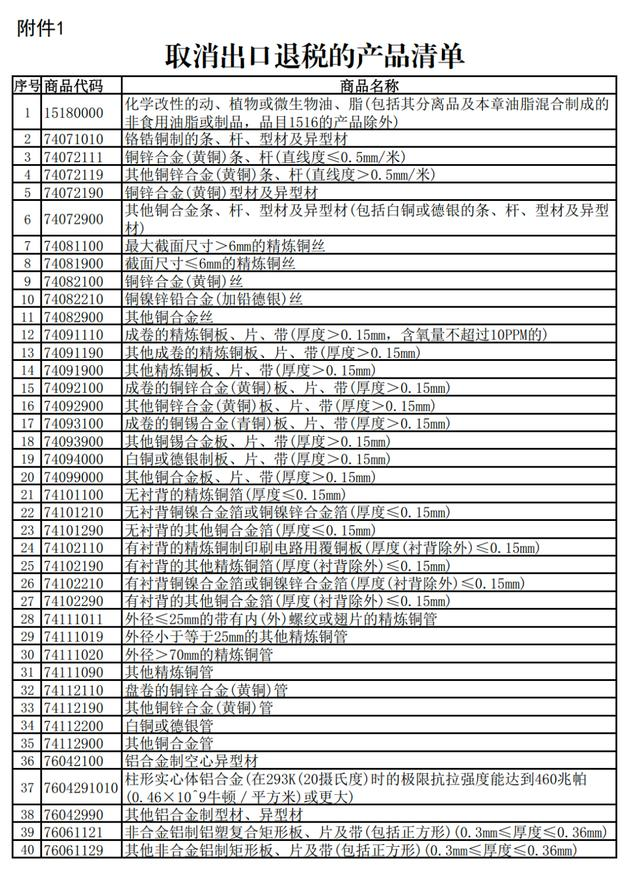 一、取消鋁材、銅材以及化學(xué)改性的動(dòng)、植物或微生物油、脂等產(chǎn)品出口退稅。具體產(chǎn)品清單見(jiàn)附件1。