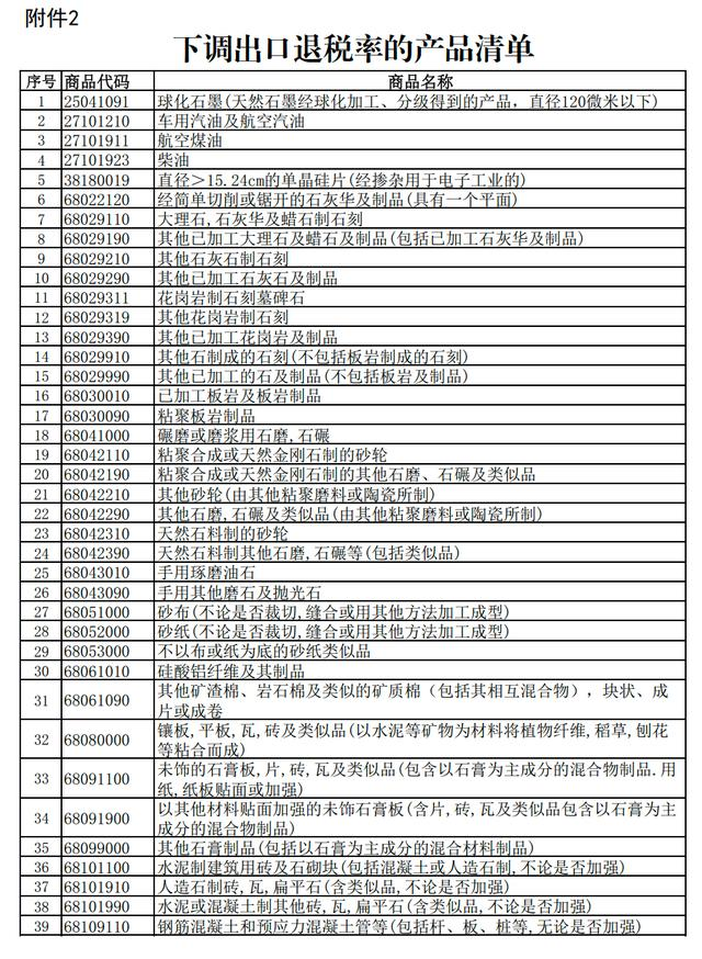 二、將部分成品油、光伏、電池、部分非金屬礦物制品的出口退稅率由13%下調(diào)至9%。具體產(chǎn)品清單見(jiàn)附件2。