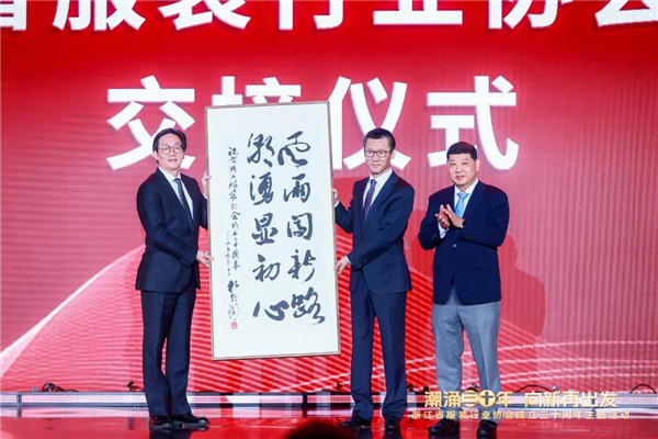 在隨后進(jìn)行的新老會(huì)長交接儀式上,中國紡織工業(yè)聯(lián)合會(huì)副會(huì)長、中國服裝協(xié)會(huì)會(huì)長陳大鵬,浙江服裝行業(yè)協(xié)會(huì)第七屆會(huì)長馮德虎共同將一幅由中國紡織工業(yè)聯(lián)合會(huì)原會(huì)長杜鈺洲親筆題寫的“風(fēng)雨闖新路,潮涌顯初心”的墨寶交到新任會(huì)長鄭念華手中。這一莊重的交接儀式,不僅是對(duì)老一輩服裝人的崇高敬意,更是對(duì)新一代服裝人的殷切期望與重托。