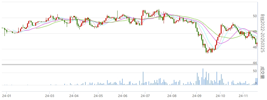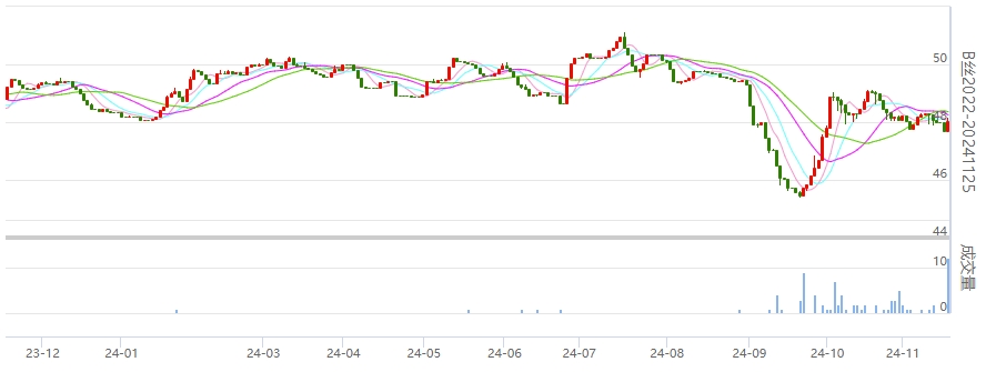 今日(2024年11月19日,周二)中國繭絲綢交易市場生絲電子指數(shù)上漲0.25%收于4713.25點。B絲2022D(商檢4A級生絲):241125合約上漲0.33萬元報收于48.03萬元;250325合約上漲0.12萬元報收于46.77萬元;250925合約上漲0.27萬元報收于46.44萬元。