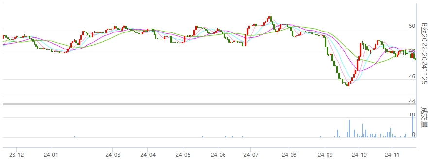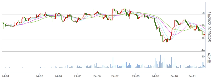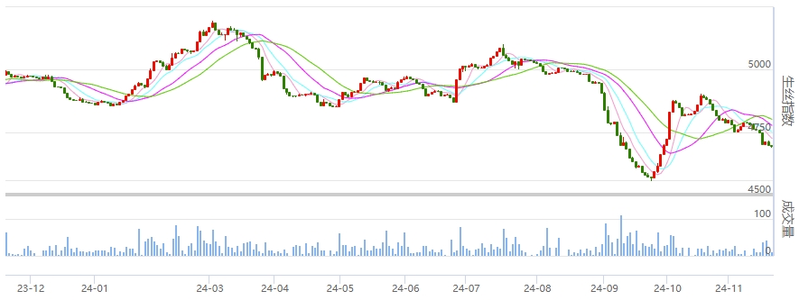 今日(2024年11月21日,周四)中國(guó)繭絲綢交易市場(chǎng)生絲電子指數(shù)下跌0.10%收于4693.06點(diǎn)。B絲2022D(商檢4A級(jí)生絲):241125合約下跌0.15萬(wàn)元報(bào)收于47.52萬(wàn)元;250325合約上漲0.09萬(wàn)元報(bào)收于46.83萬(wàn)元;250925合約上漲0.09萬(wàn)元報(bào)收于46.41萬(wàn)元。