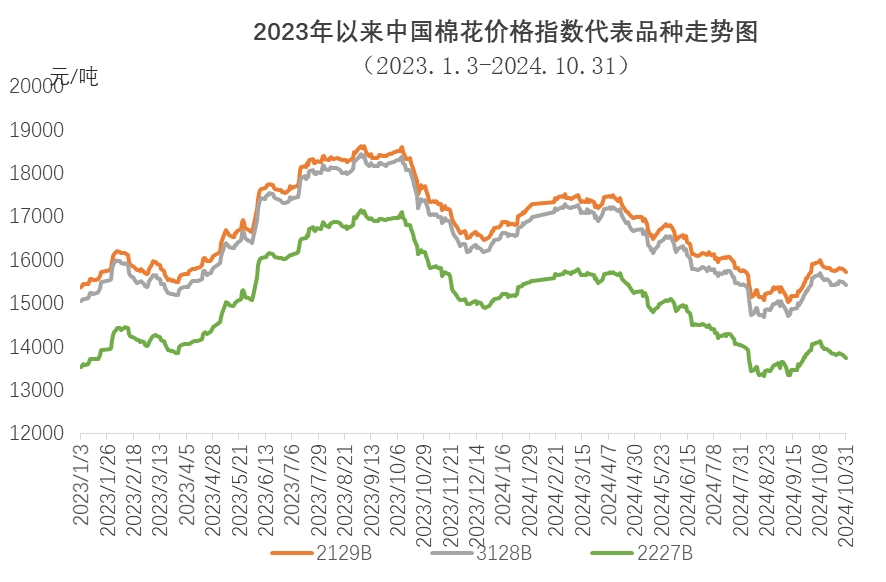 10月,棉紡織企業(yè)需求整體維持前月較好水平,棉花企業(yè)銷售積極。受整體商品市場上漲帶動,10月8日中國棉花價格指數(CCIndex3128B)最高漲至15691元/噸,中下旬在新棉大量上市、市場資源量大幅增加、紡織成品價格下跌等因素的影響下,31日中國棉花價格指數下跌至月內低點15410元/噸。中國棉花價格指數(CCIndex3128B)月均價為15528元/噸,環(huán)比上漲503元,同比下跌2403元。
