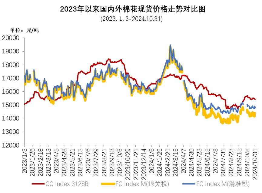 10月上旬,美國經濟數據較好導致美聯儲降息不確定性增加,國際棉價在73美分/磅附近震蕩;中旬USDA月報上調棉花產量,疊加美棉簽約持續(xù)偏弱,棉價顯著走低,下探至70美分/磅附近;隨后美國失業(yè)率環(huán)比增高,美聯儲降息預期升溫,疊加外圍能源、谷物市場上漲,棉價反彈至72.5美分/磅附近;月末,美國大選結果未定,棉價再次回落至70美分/磅。10月ICE期棉主力合約月均結算價在71.72美分/磅,環(huán)比上漲0.4美分,漲幅0.6%。中國進口棉價格指數FCIndex M月均為82.14美分/磅,環(huán)比上漲0.65美分;月底為81.69美分/磅,環(huán)比下跌1.42美分,1%關稅下折人民幣14251元/噸,低于同期中國棉花價格指數(CCIndex3128B)1159元,內外棉價差擴大。