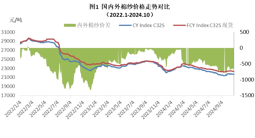本月內(nèi)外棉紗價(jià)格均價(jià)上漲,國產(chǎn)32支純棉紗均價(jià)為21717元/噸,環(huán)比上漲222元,漲幅1%,同比下跌2443元,跌幅10.1%;進(jìn)口32支純棉紗10月均價(jià)22368元/噸,環(huán)比上漲112元,漲幅0.5%,同比下跌1964元,跌幅8.1%。